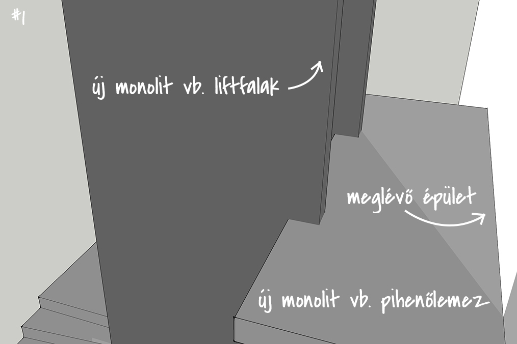 A végeredmény pedig egy olyan húzottkarú lépcső, ami egy látszó beton kígyóként tekereg a vasbeton liftmagon, a külső oldalán pedig egy árnyékolt, de nyitott és átszellőztetett üveghomlokzat határolja. Bonyolultnak tűnik? Talán igen, talán nem, de rengeteg párbeszéd és ötletelés végeredményeként végül egy olyan lépcsőt sikerült tervezni, ami építészetileg is vállalható, az adott helyen elfér, és kivitelezési szempontból sem lehetetlen küldetés. És a tartószerkezeti tervezés szépségét pontosan a fentebb leírt lépések teszik széppé és izgalmassá.