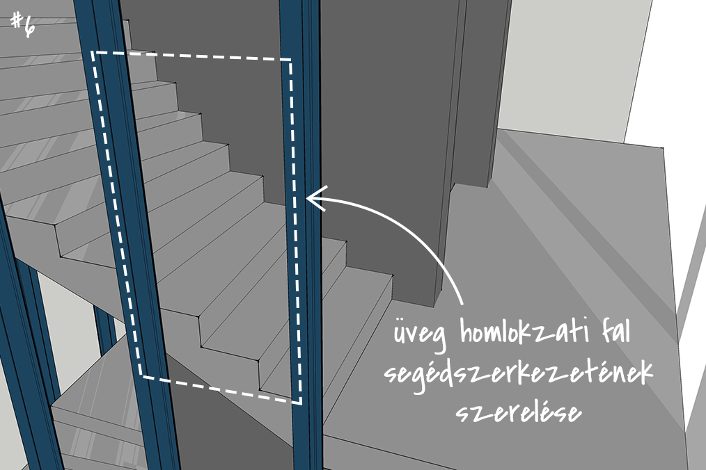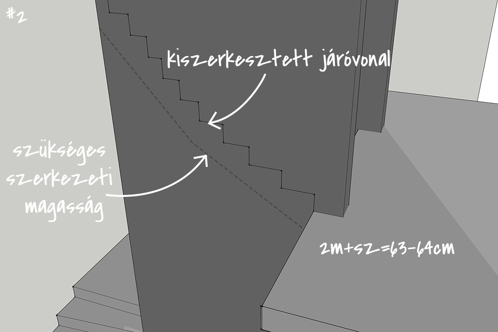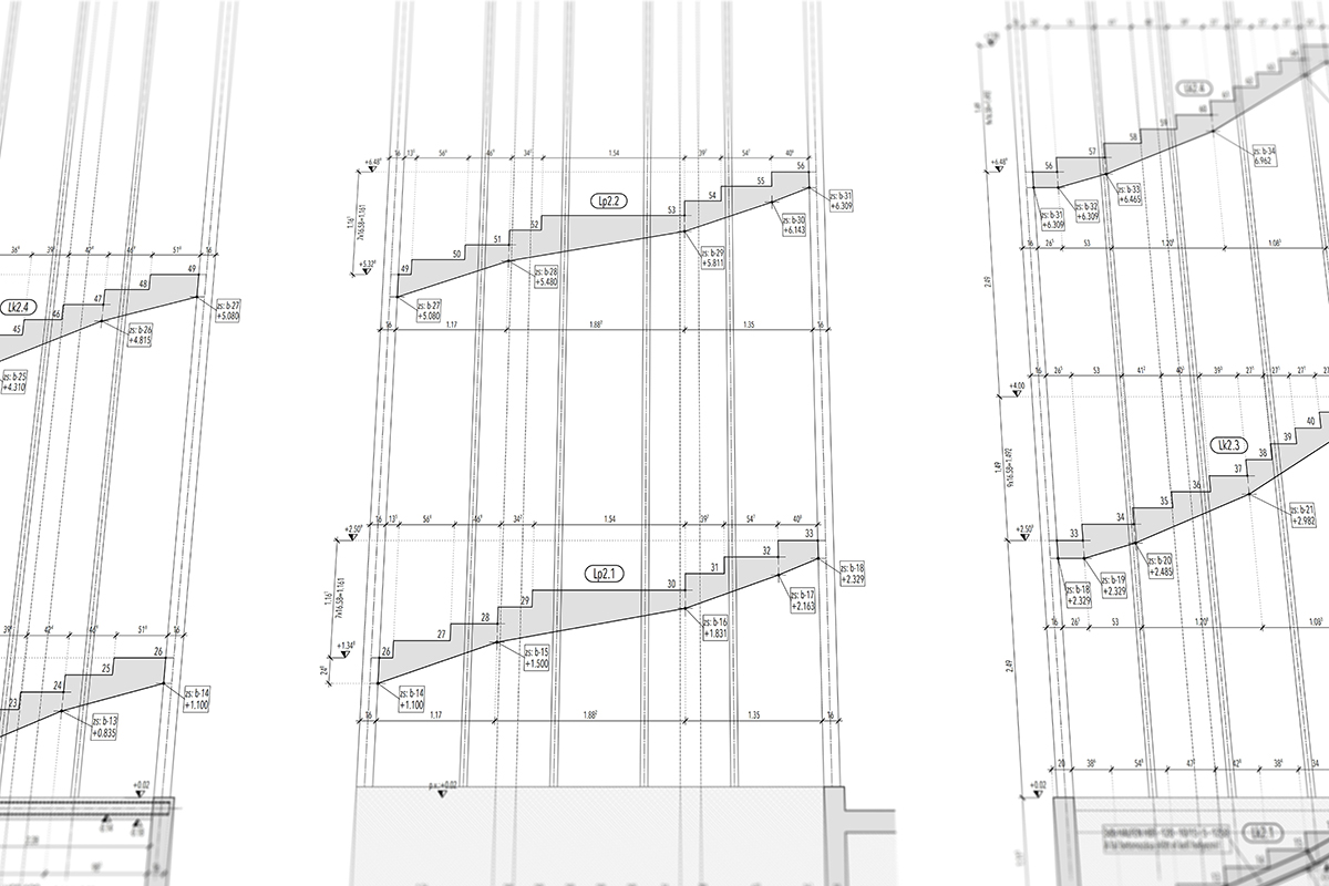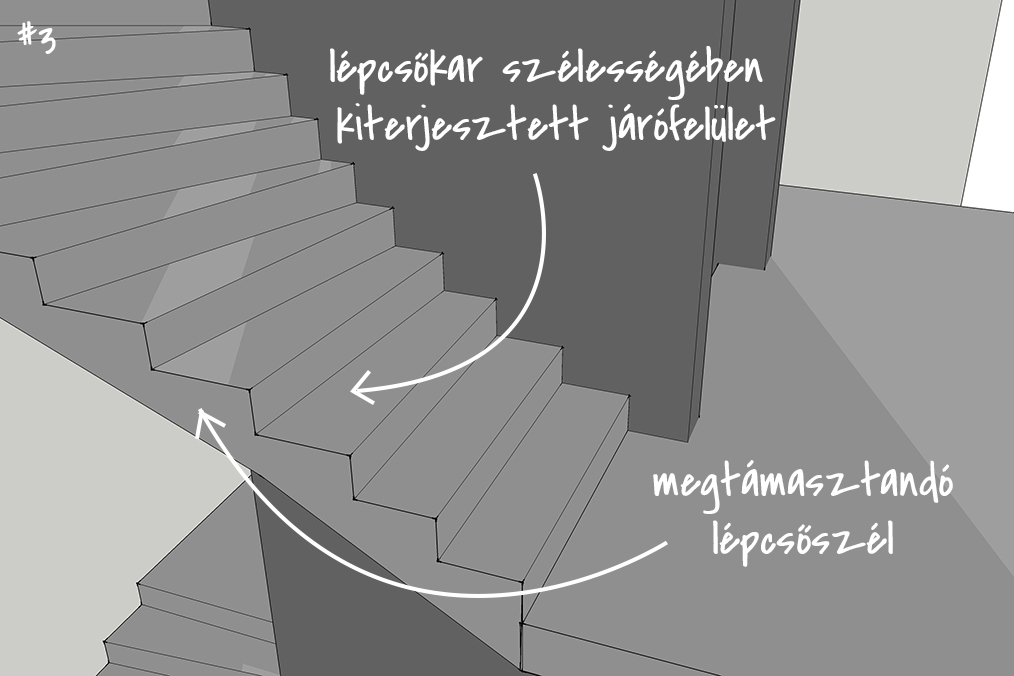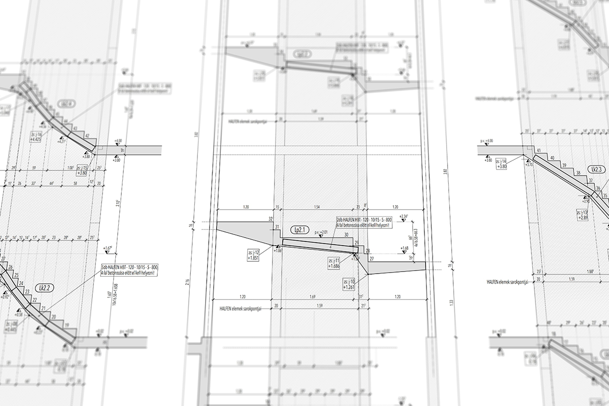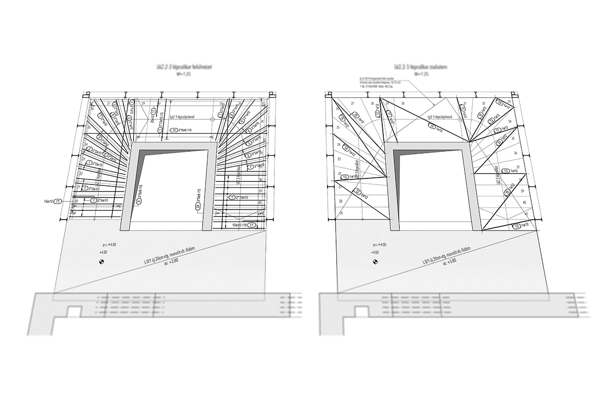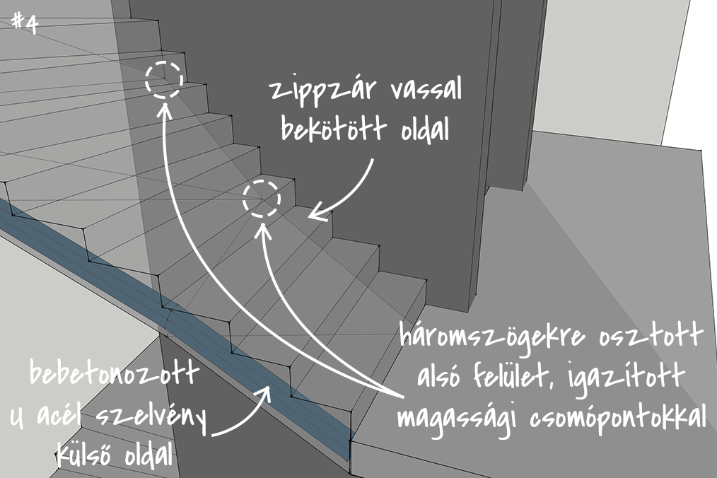 Az első nekifutásnál azért egyből feltűntek a buktatók: a helyenként vállalhatatlanul meghízó vagy elfogyó beton keresztmetszet, és fejvakarás, hogy ezt hogy lehet rajzilag emészthető formában is megmutatni. Így a lépcső felülnézet mellett, ahol a lépcsőfokokra szépen sorszámokkal lehet hivatkozni, készült egy olyan zsaluzási terv, ahol a háromszögek töréspontjait mutattuk meg alulról. A statikai váza innentől pedig egy kéttámaszú lemezre egyszerűsödik, melynek az alsó részére háromszög alaprajzú, felvastagodó betonréteg „csimpaszkodik”. A lépcső belső oldalán a vasbeton falra támaszkodik, ezeket zippzár vasakkal be lehet kötni a vasbeton falba, a külső oldalán pedig az acél pilléreket összekötő U szelvényre, amit a lépcsőkarba betonozunk.
